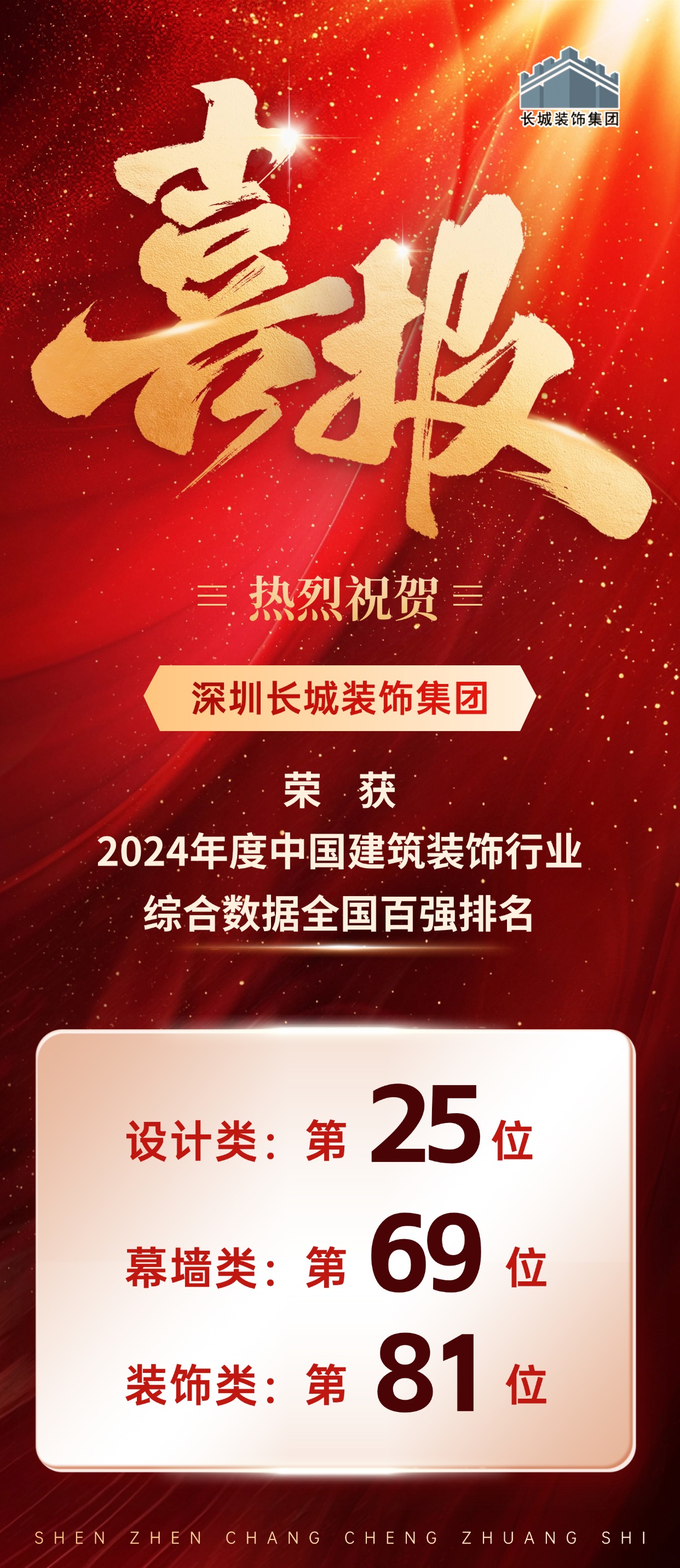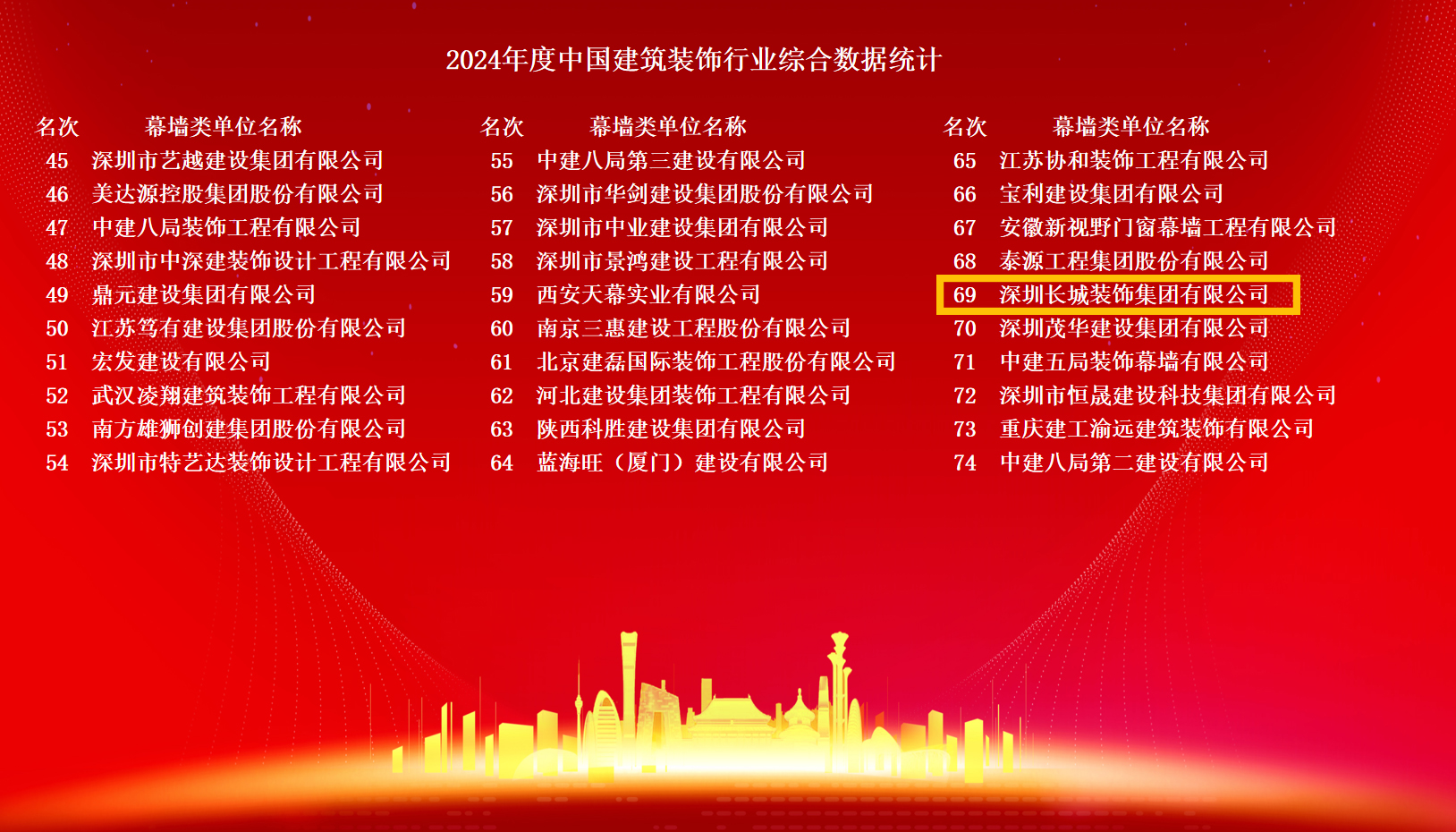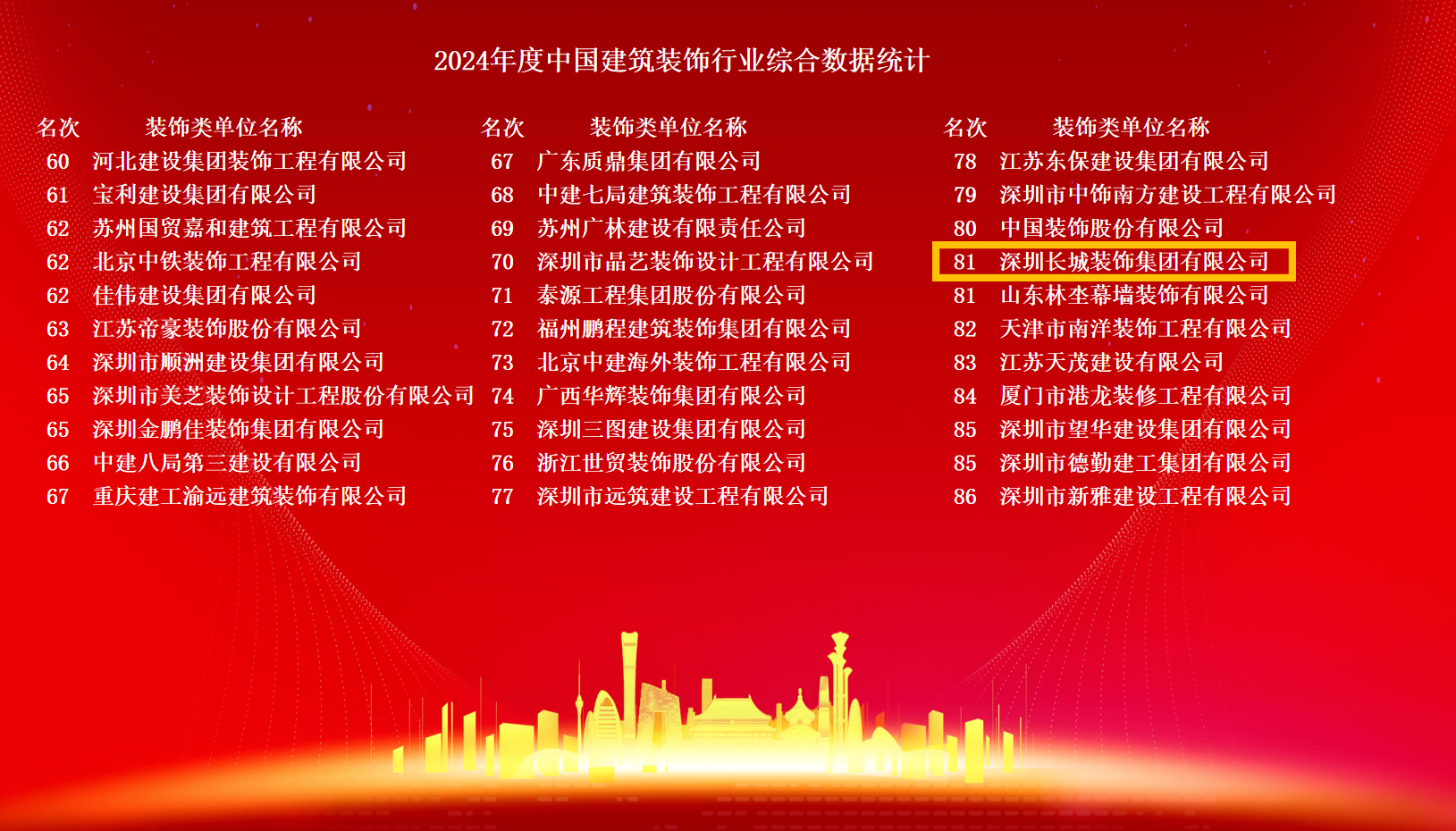 近日,中國建筑裝飾協(xié)會(huì)正式發(fā)布2024年度行業(yè)綜合數(shù)據(jù)統(tǒng)計(jì)結(jié)果,深圳長城裝飾憑借穩(wěn)健的經(jīng)營業(yè)績、領(lǐng)先的技術(shù)研發(fā)能力及優(yōu)質(zhì)的客戶服務(wù),再度入選行業(yè)百強(qiáng)企業(yè),核心業(yè)務(wù)領(lǐng)域排名實(shí)現(xiàn)穩(wěn)步進(jìn)階。
