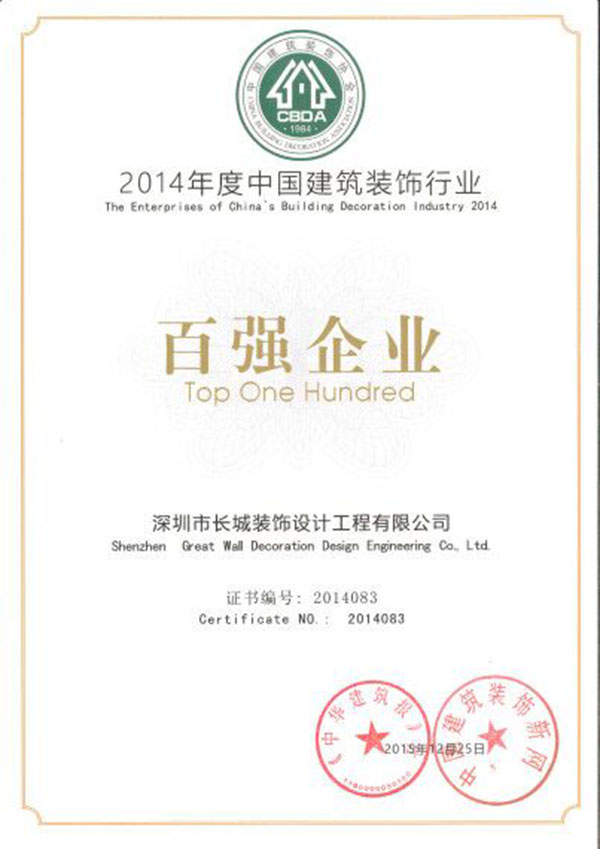 12月15日,中國建筑裝飾行業(yè)百強評價辦公室發(fā)布了“2014年度中國建筑裝飾百強企業(yè)公示入選名單 ”,深圳市長城裝飾設(shè)計工程有限公司榮獲“2014年度中國建筑裝飾行業(yè)百強企業(yè)”第83名,比2013年度 前進13名,說明在長城人的共同努力下公司的整體實力進一步增強。