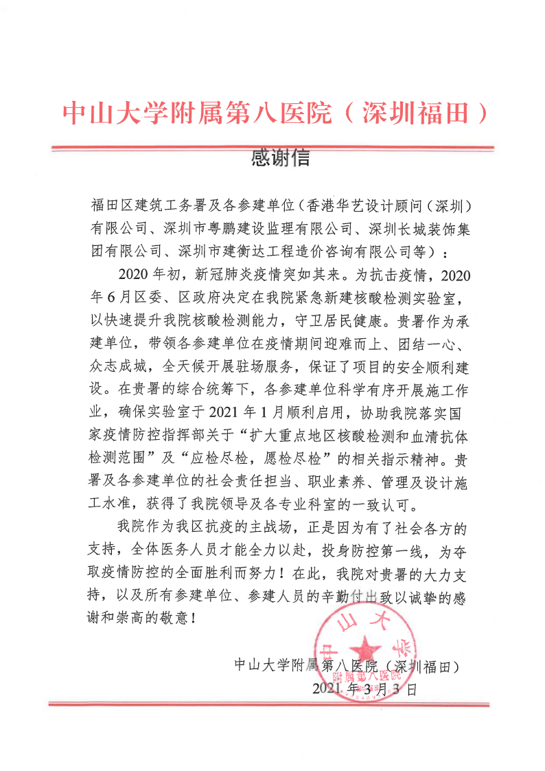 近日,公司承接的“中山大學附屬第八醫(yī)院核酸檢測實驗室項目”收到中山大學附屬第八醫(yī)院(深圳福田)發(fā)來的感謝信。