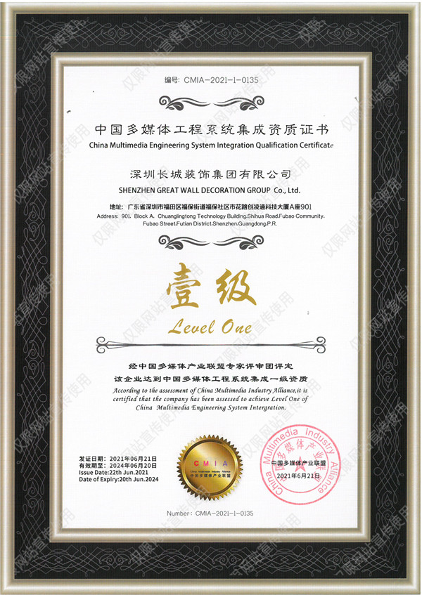 經(jīng)由中國多媒體產(chǎn)業(yè)聯(lián)盟(China Multimedia Industry Alliance,簡稱CMIA)專家評審團評定審核,長城裝飾集團獲得“中國多媒體工程系統(tǒng)集成一級資質(zhì)”。為集團承包事業(yè)全面發(fā)展再添基石。