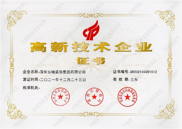 2022-2-17近日,深圳長城裝飾集團獲得深圳市科技創(chuàng)新委員會、深圳市財政委員會、深圳市國家稅務局及深圳市地方稅務局聯(lián)合頒發(fā)的“高新技術(shù)企業(yè)”認定,認定時間為2021年,有效期為3年。這是公司自2017年首次通過 “高新技術(shù)企業(yè)”認定以來,第二次被認定為“高新技術(shù)企業(yè)”。