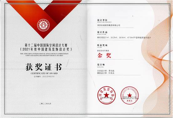 中國國際空間設(shè)計大賽(中國建筑裝飾設(shè)計獎)是中國建筑裝飾協(xié)會組織實施的一項公益性的賽事,旨在促進空間設(shè)計的學(xué)術(shù)交流,提升空間設(shè)計的藝術(shù)水準(zhǔn)和技術(shù)水平,以高質(zhì)量的設(shè)計推動建筑裝飾產(chǎn)業(yè)高質(zhì)量的發(fā)展。第十二屆中國國際空間設(shè)計大賽獲獎名單于當(dāng)日揭曉。我司參賽作品“南約項目樣板房室內(nèi)設(shè)計”榮獲了第十二屆中國國際空間設(shè)計大賽居住空間類金獎。