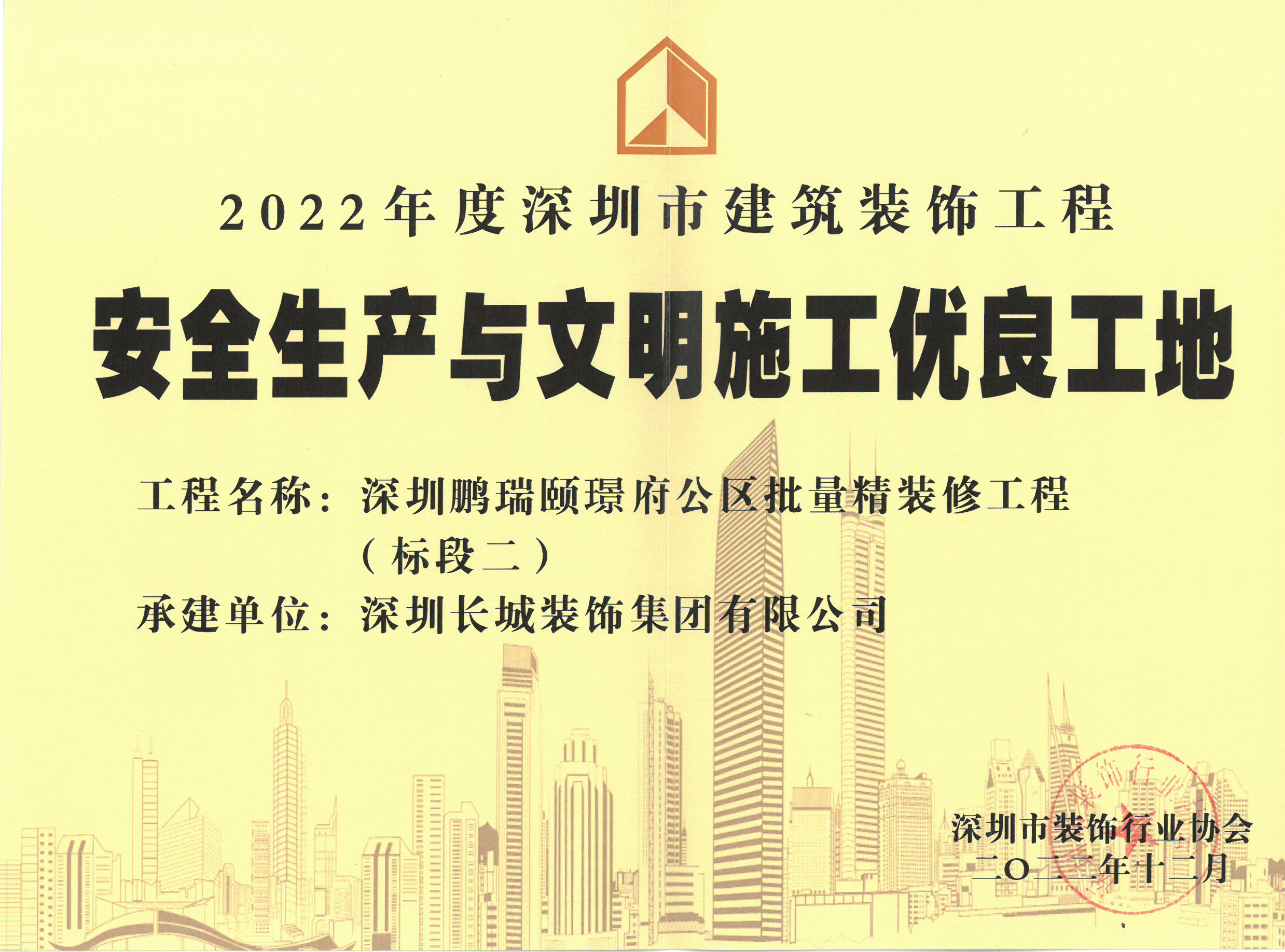 2023-3-24由深圳長(zhǎng)城裝飾集團(tuán)有限公司申報(bào)的“深圳鵬瑞熙璟府公區(qū)批量精裝修工程(標(biāo)段二)”項(xiàng)目經(jīng)過初審,專家組現(xiàn)場(chǎng)檢查、復(fù)查,深圳市裝飾行業(yè)協(xié)會(huì)審定,榮獲“2022年度深圳市建筑裝飾工程安全生產(chǎn)與文明施工優(yōu)良工地”稱號(hào)。