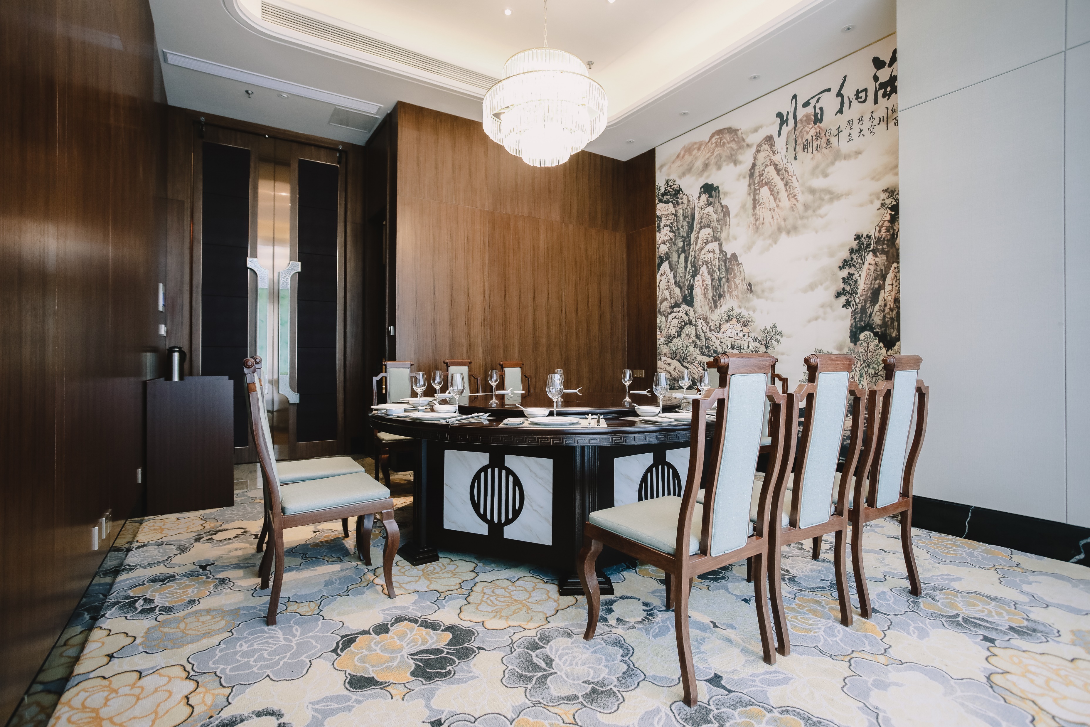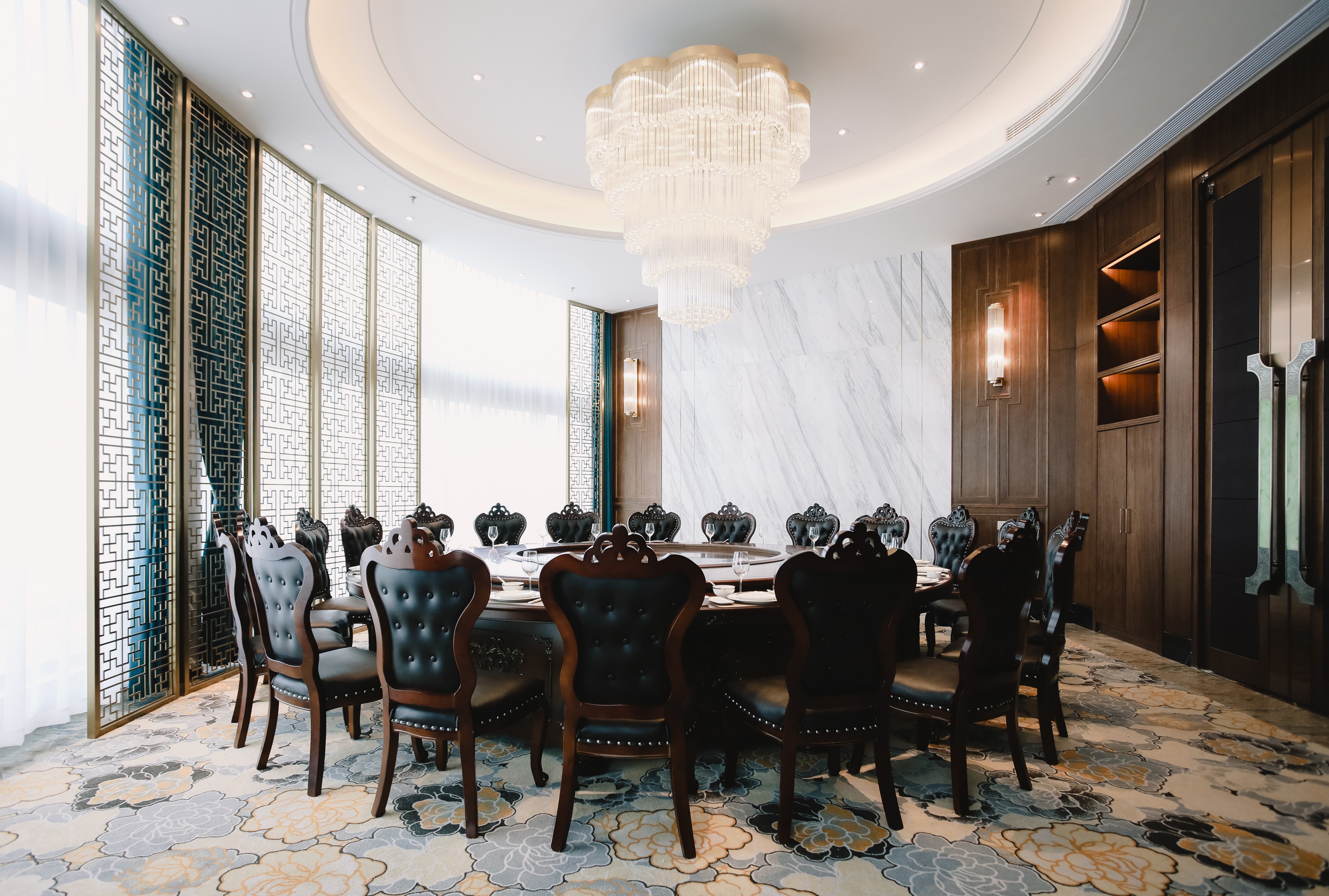 亮點介紹:造型天花順直,平整,墻面木飾面造型接縫嚴(yán)密,地面手工繡花圖案地毯圖案連續(xù),體現(xiàn)高檔的用餐體驗。