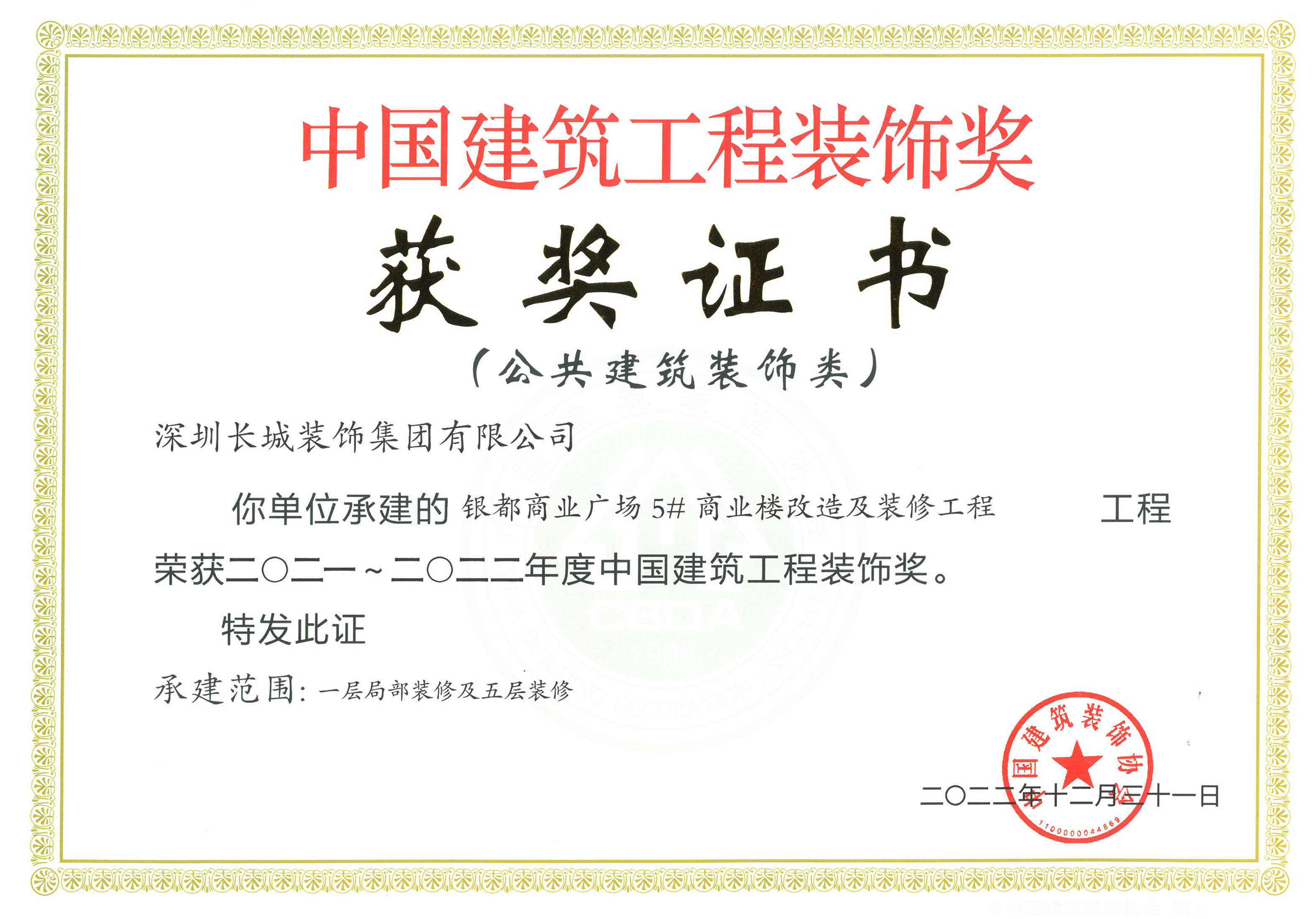 2023-3-28近日,中國建筑裝飾行業(yè) “學(xué)習(xí)貫徹黨的二十大精神 促進(jìn)行業(yè)高質(zhì)量發(fā)展”報告會暨裝飾獎科技獎頒獎、行業(yè)統(tǒng)計發(fā)布會在北京會議中心隆重舉行。由深圳長城裝飾集團(tuán)有限公司承建的銀都商業(yè)廣場5#商業(yè)樓(5層)改造及裝修工程斬獲“中國建筑工程裝飾獎”這一行業(yè)至高榮譽(yù)。