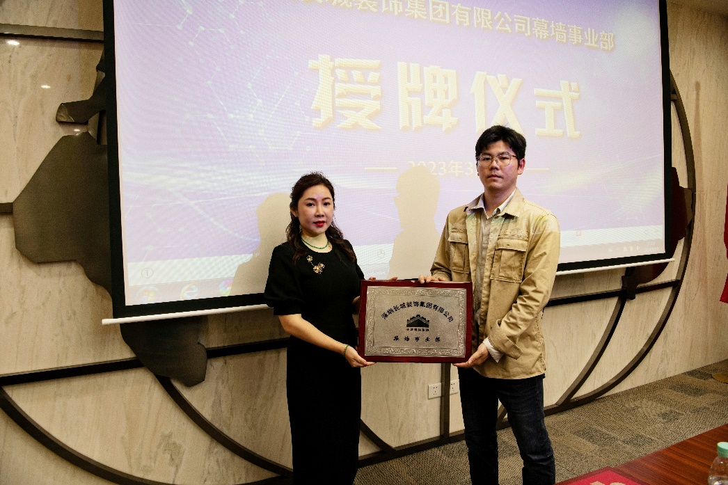 在授牌儀式中,集團副總裁王學兵宣讀了杜梅靜的聘任書,集團總裁葉展華代表集團頒發(fā)了聘任書及幕墻事業(yè)部牌匾,并向幕墻事業(yè)部杜梅靜總經(jīng)理表示熱烈的祝賀。