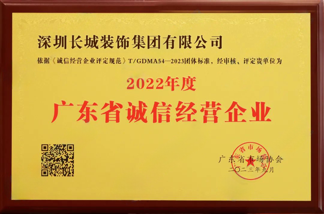 2023-9-28近期,深圳長(zhǎng)城裝飾集團(tuán)被正式授予“2022年度廣東省誠(chéng)信經(jīng)營(yíng)企業(yè)”稱號(hào),這一榮譽(yù)是對(duì)長(zhǎng)城裝飾長(zhǎng)期以來(lái)在工程服務(wù)業(yè)領(lǐng)域堅(jiān)持誠(chéng)信經(jīng)營(yíng)理念的肯定及認(rèn)可。