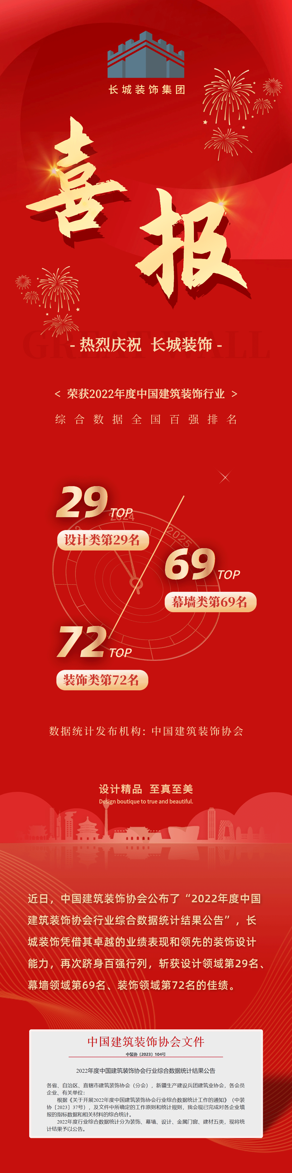 喜訊丨長城裝飾集團榮登中國建筑裝飾行業(yè)百強榜單!