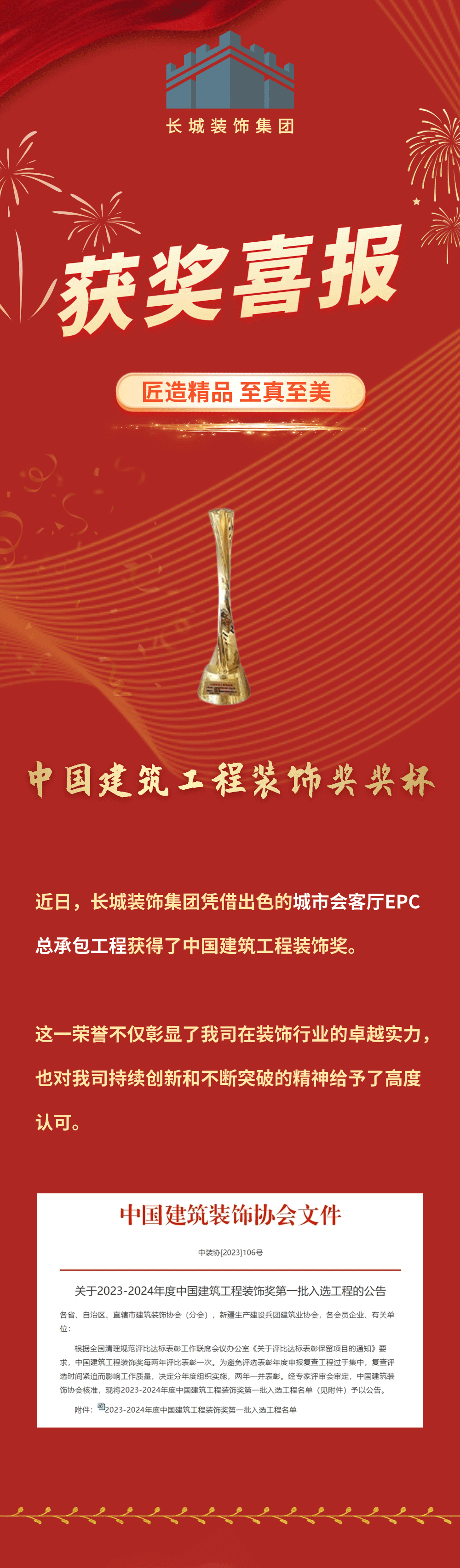 喜訊 | 長(zhǎng)城裝飾集團(tuán)再添中國(guó)建筑工程裝飾獎(jiǎng)!