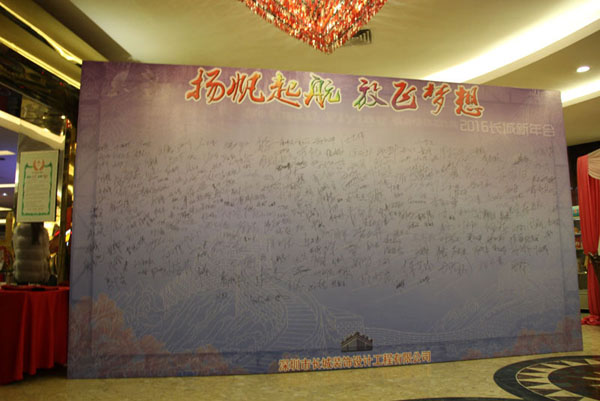 下午五點開始嘉賓陸續(xù)到場,長城人以最熱烈的掌聲歡迎各位嘉賓的到來,各位嘉賓在簽到墻上簽字留念。